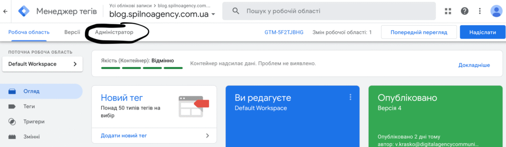 - In the container’s top menu, select the “Admin” tab.