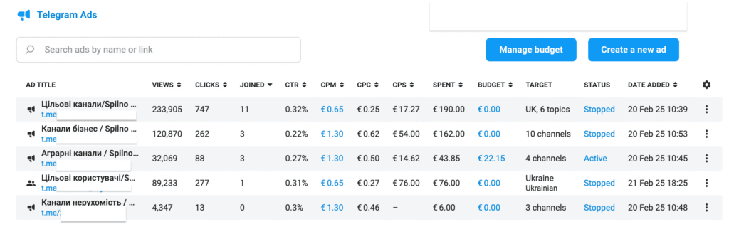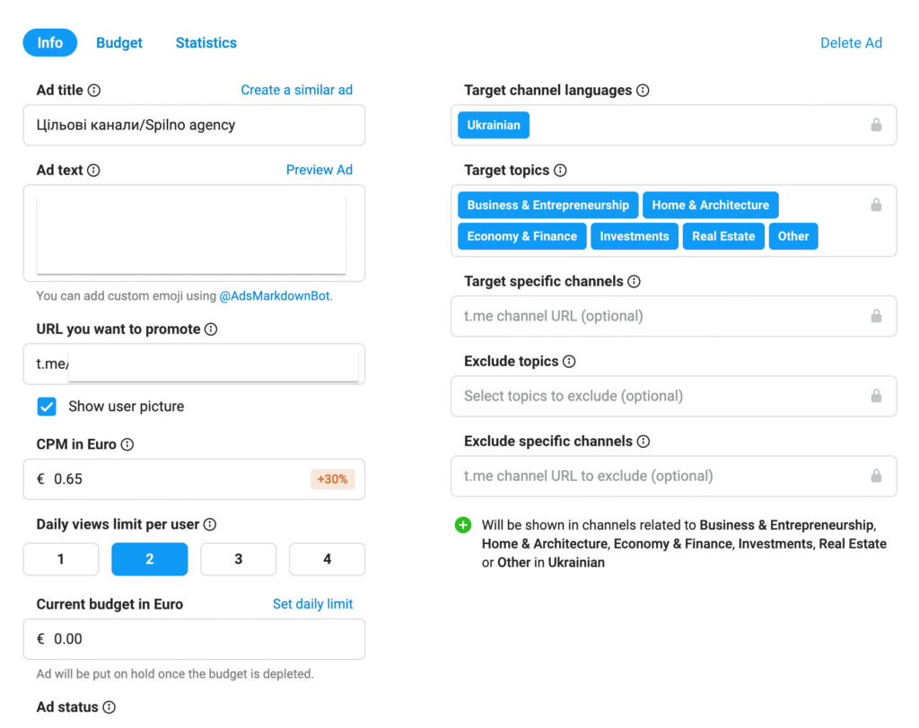 Postanowiliśmy przetestować kanał Telegram Ads, kierując reklamy na kanały, którymi użytkownicy mogliby być potencjalnie zainteresowani. W szczególności kanały związane z rolnictwem i biznesem. Budżet na testy wynosi 500 euro.
